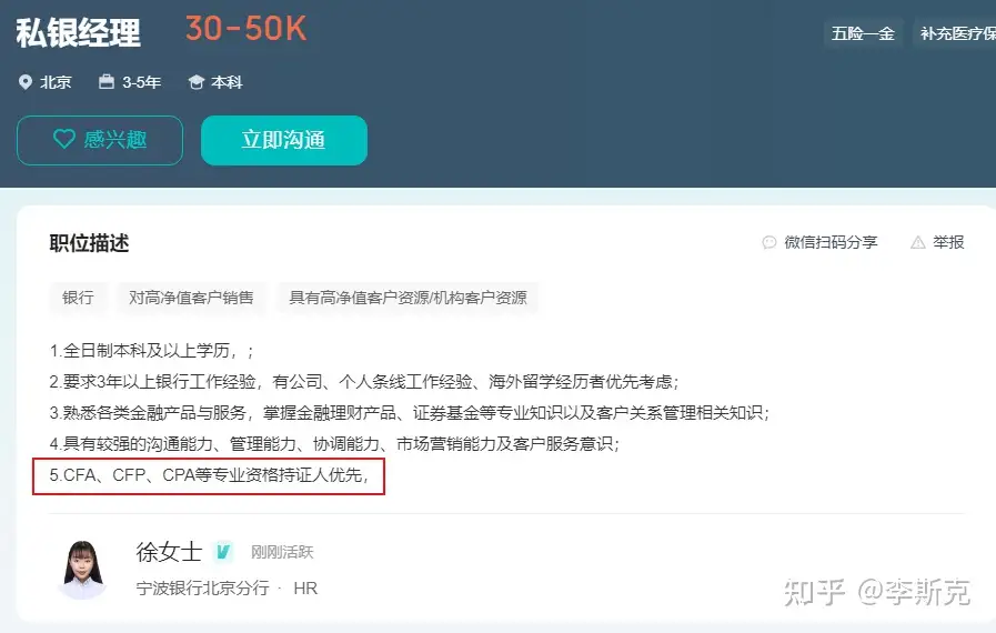 CFA作为金融行业的高含金量证书,也是银行人拿到高薪的重要砝码。不少银行在职位描述中都明确指出,“CFA持证人优先”。