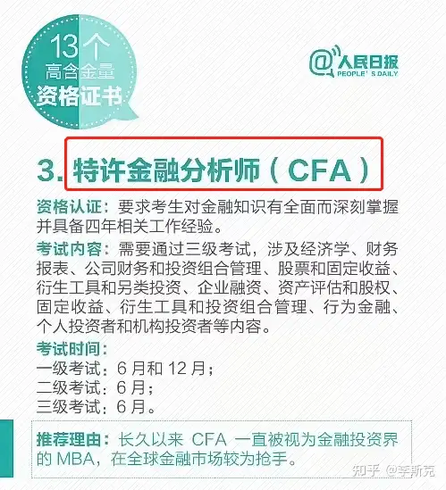 今天,小编为大家推荐金融行业高含金量证书CFA。CFA中文叫特许金融分析师,是全球金融行业里高含金量的资格认证,《人民日报》曾推荐为值得考的证书之一。